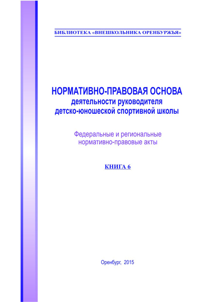 Нормативно-правовая основа деятельности руководителя учреждения дополнительного образования детей : федеральные и региональные нормативно-правовые акты по вопросам деятельности УДОД : кн. 6 / сост. Н. Д. Иванова. – Оренбург: ООДТДМ, 2015. – 178 с. + CD Данный выпуск «Библиотеки «Внешкольника Оренбуржья» будет интересен руководителям образовательных учреждений спортивной направленности, методистам, педагогам, так как содержит материалы по проблемам нормативно-правового обеспечения образовательной деятельности спортивных школ и секций учреждений дополнительного образования. Это актуально особенно сейчас, в период внедрения комплексных проектов модернизации образования и связанными с этим изменениями. |